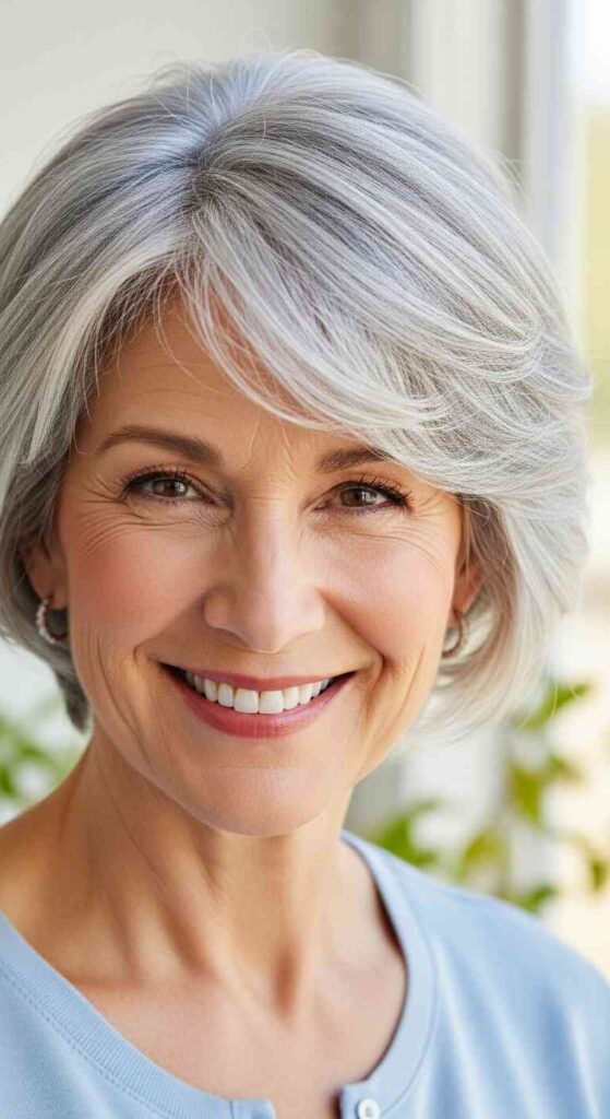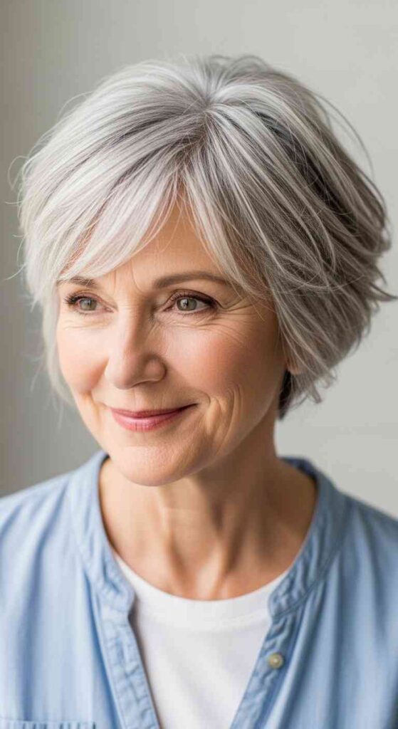 Gray hair’s unique properties become universal rather than occasional for most women over 60. Gray hair is typically coarser, more wiry, and can be more challenging to style than pigmented hair. However, it also offers unique beauty—the natural shimmer, the range from salt-and-pepper through pure silver to brilliant white, and the genuine elegance that well-maintained gray hair provides. Choosing cuts that work specifically with gray hair’s characteristics rather than generic cutting approaches ensures best results.