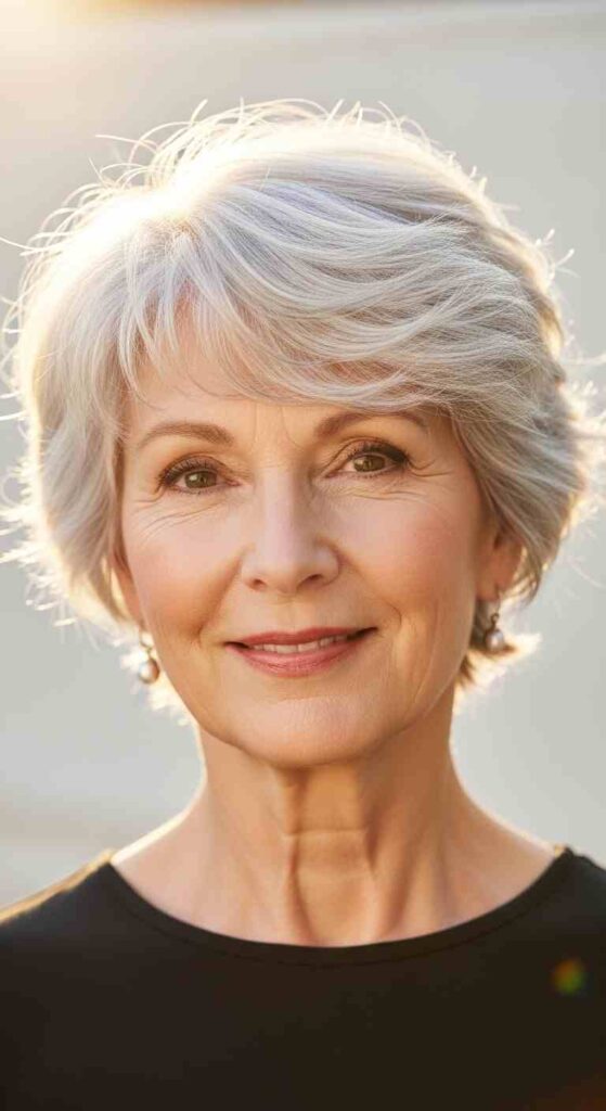Pixie with wispy texture creates soft feminine ease for 60+.