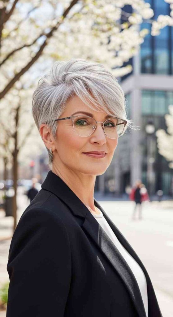 Ultra-short tapered crop celebrates natural gray with minimal maintenance for 60+.