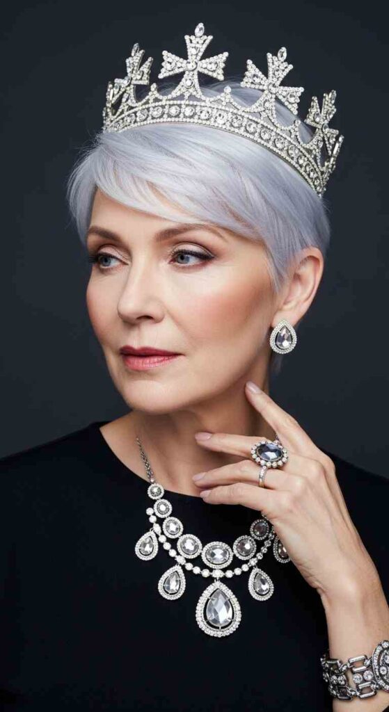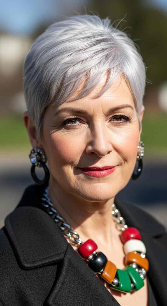 Very short crop celebrating full silver creates regal confident beauty for 60+.