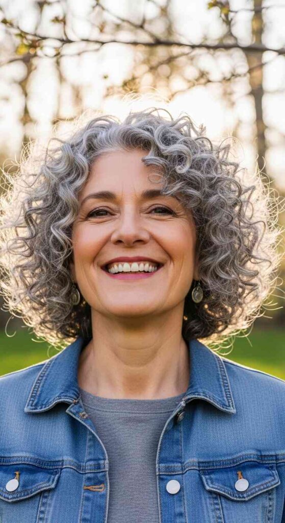 Short cut embracing natural curls creates joyful authentic texture for 60+.