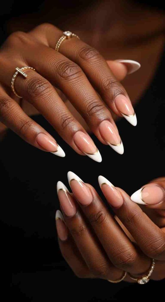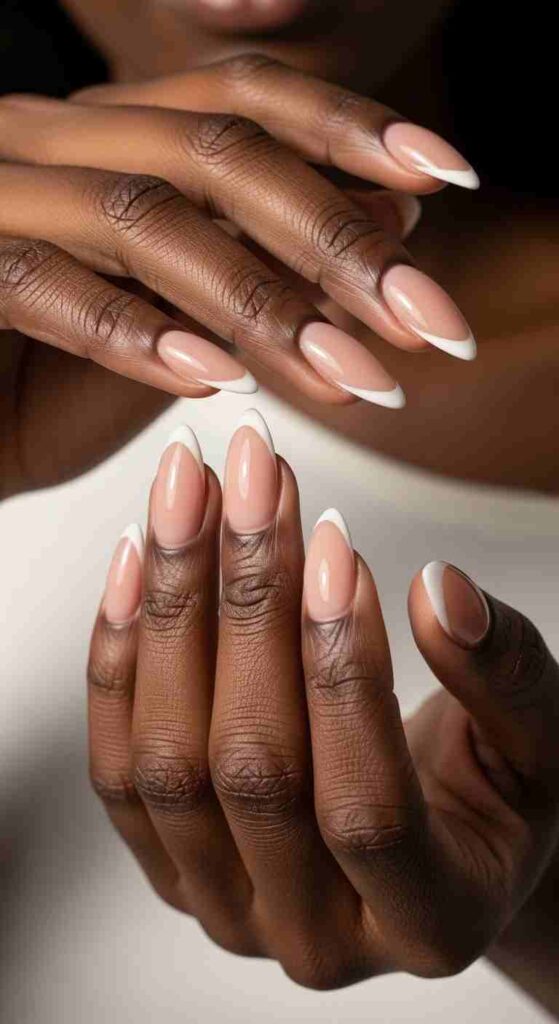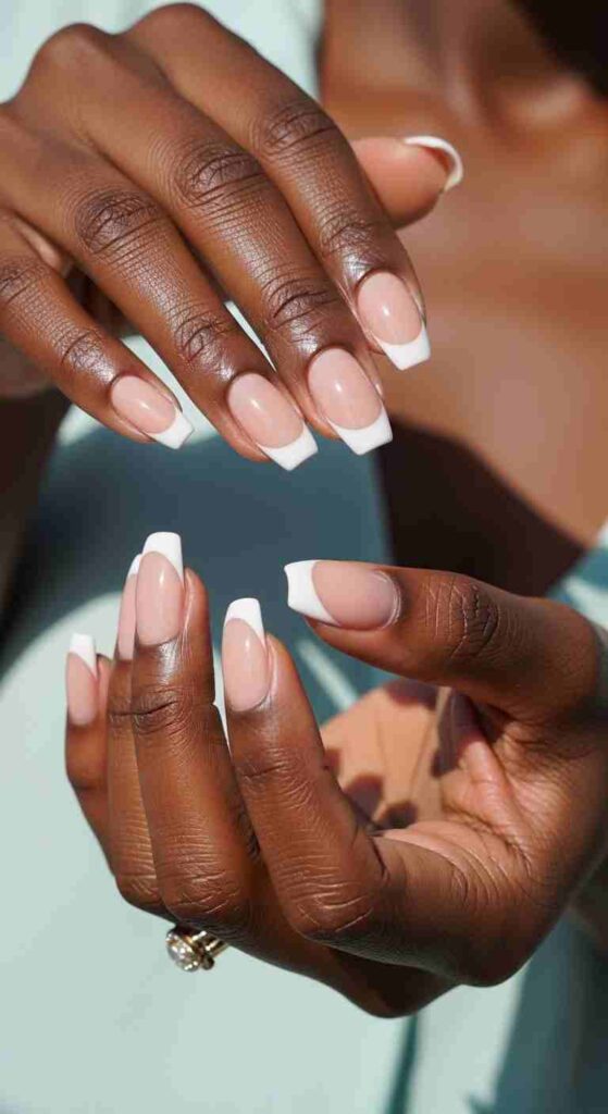 White tips create classic elegance with maximum contrast—the traditional choice remains stunning on Black skin specifically because the contrast is so dramatic. White French tips on melanin say “timeless sophistication” with confidence that the same tips whisper on lighter skin.