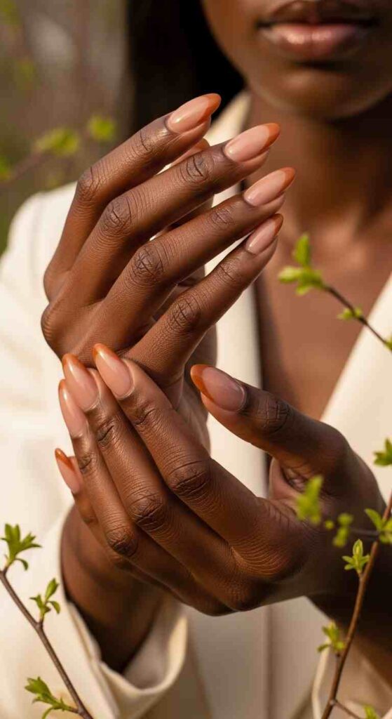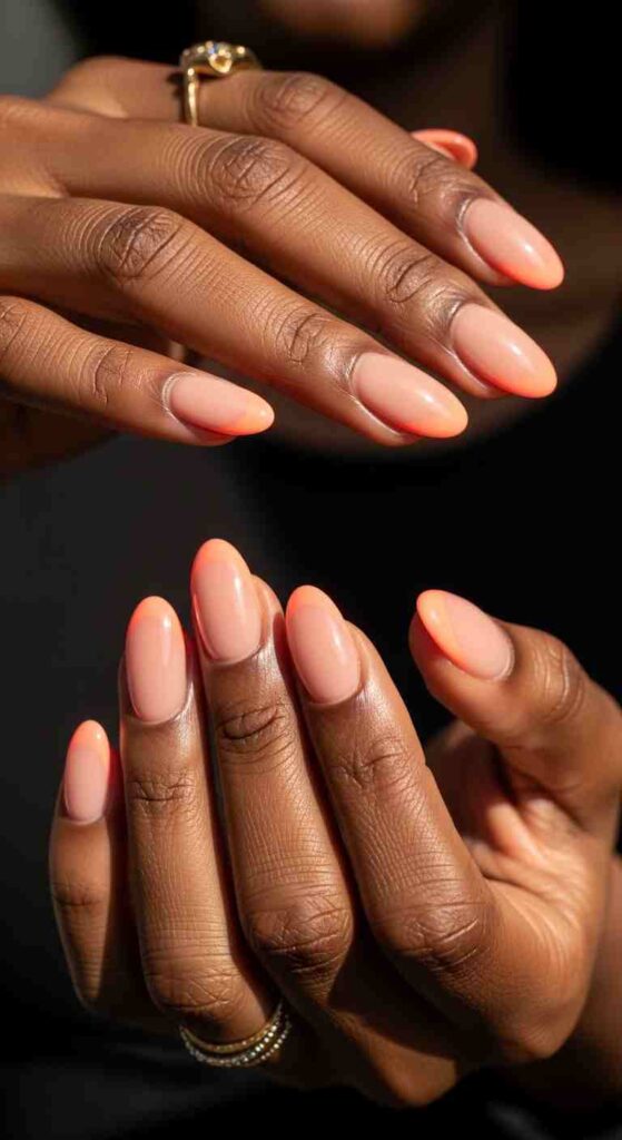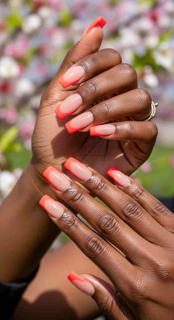 Warm-colored tips (coral, peach, orange, warm pink) create harmonious glow—these colors complement melanin’s natural warmth, creating cohesive beauty where nails and skin feel connected. Warm tips work particularly well for spring when you want colors that feel optimistic and friendly.