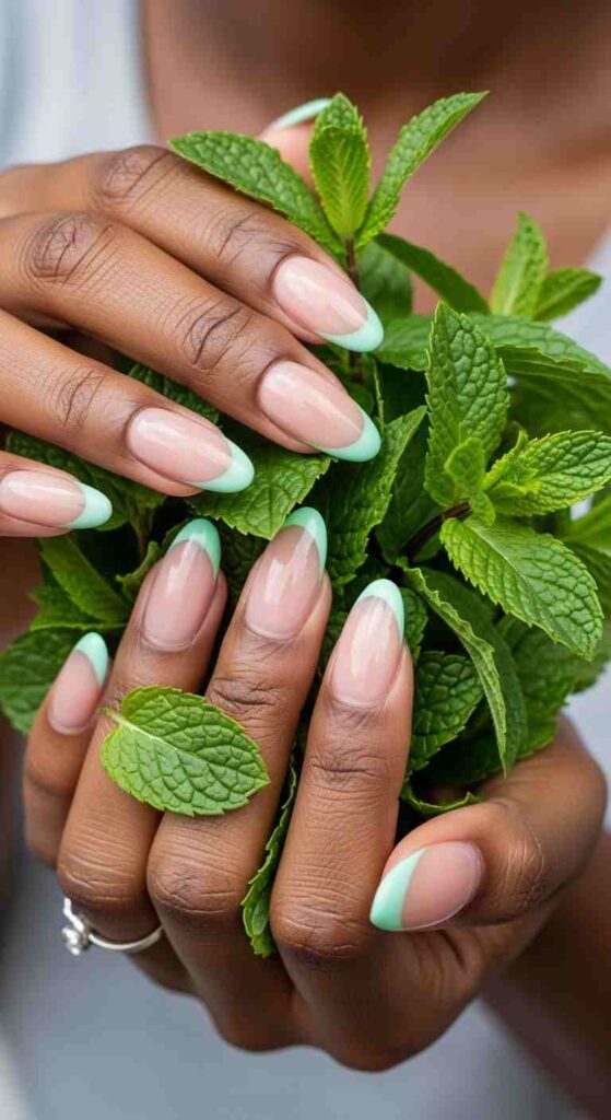 Soft mint tips creates fresh spring botanical on melanin.