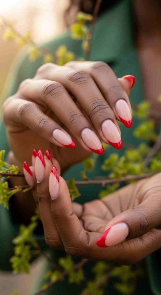 Classic red tips creates timeless spring elegance on Black skin.