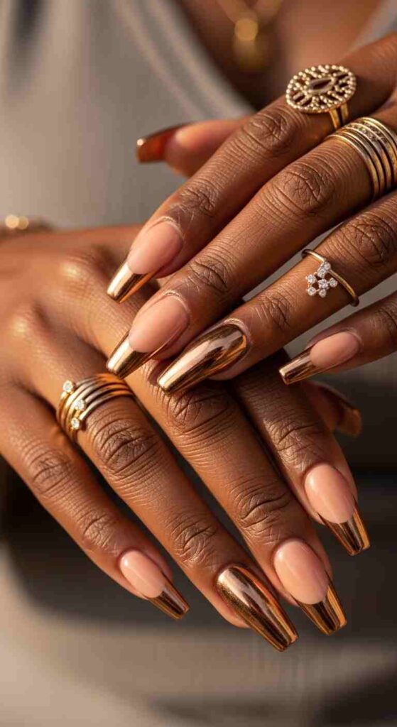 Metallic bronze tips creates warm spring shimmer on Black skin.
