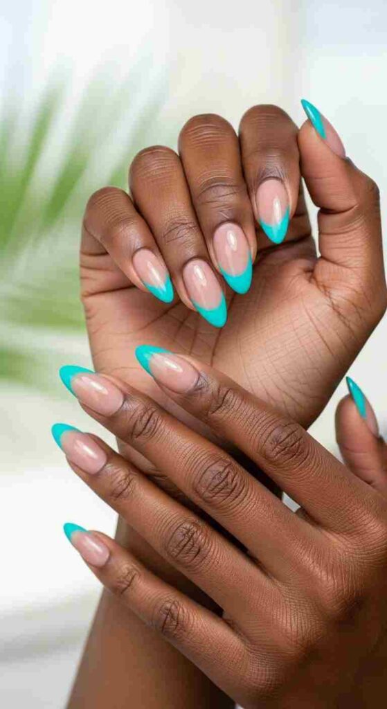 Bright turquoise tips creates tropical spring pop on melanin.