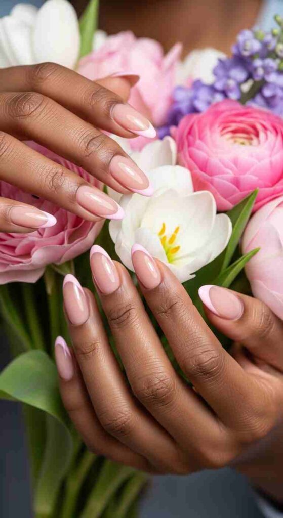 Soft pink tips creates feminine spring contrast on melanin.