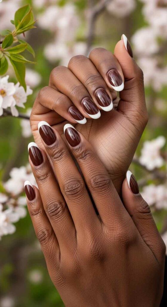 Deep brown base with cream tips creates elegant contrast on melanin.