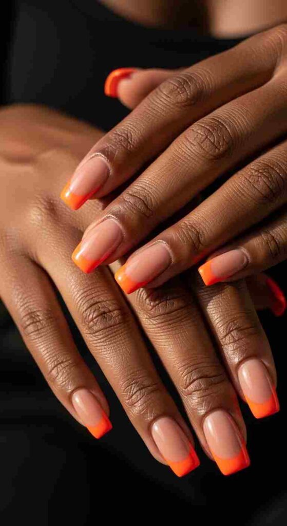 Bright orange tips creates vibrant spring warmth on Black skin.