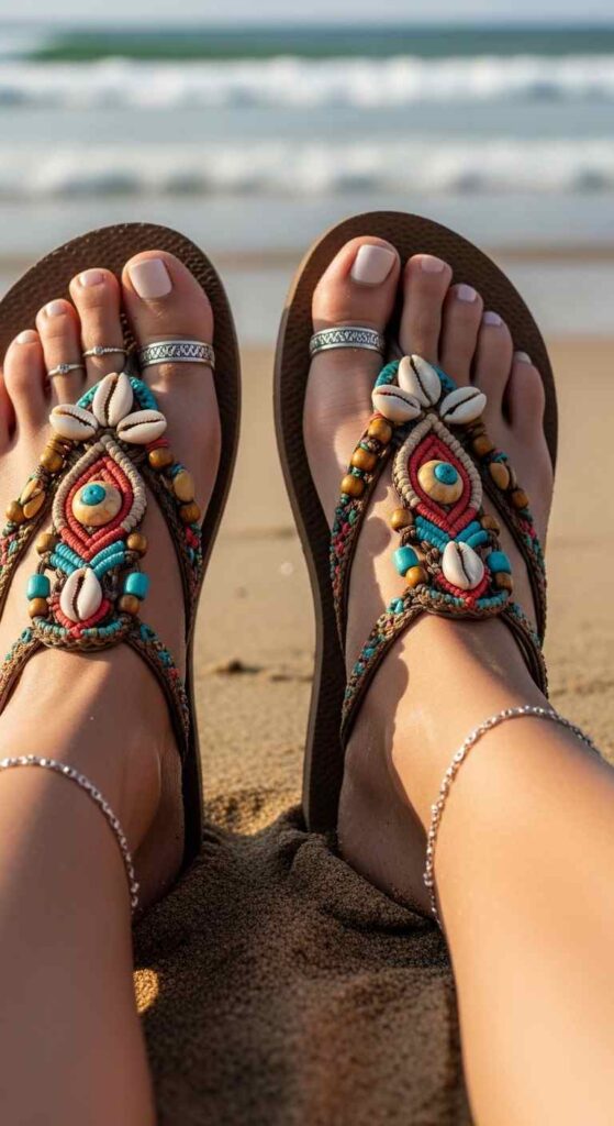 Flip-flops with toe-ring detail creates bohemian casual charm.