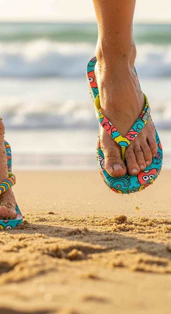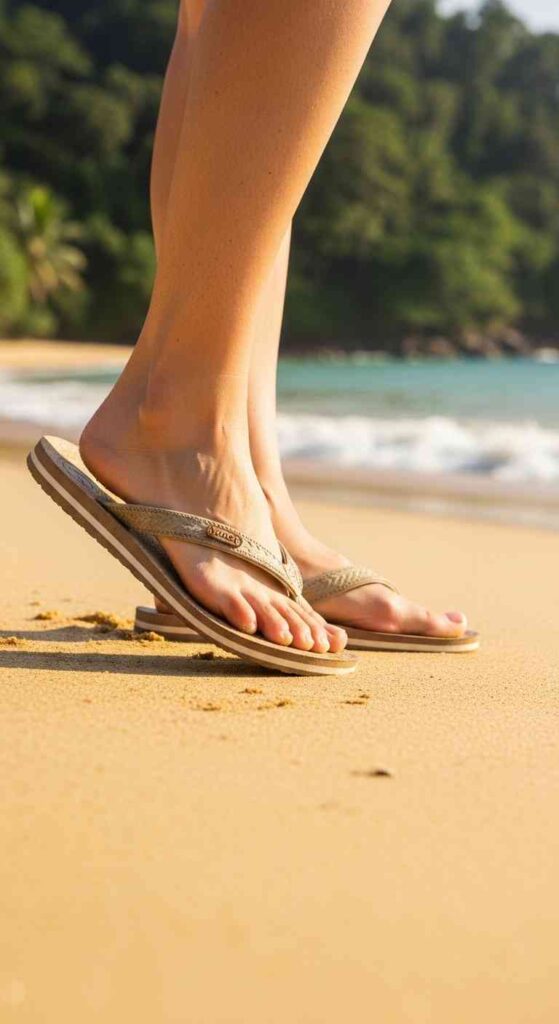 The Y-strap configuration—post between first and second toe splits into Y connecting to sole on either side, creating the “flip-flop” name from the sound they make.