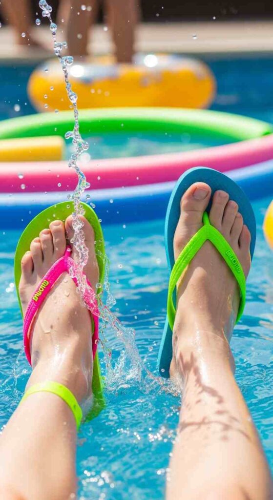 Electric neon flip-flops creates bold casual visibility.