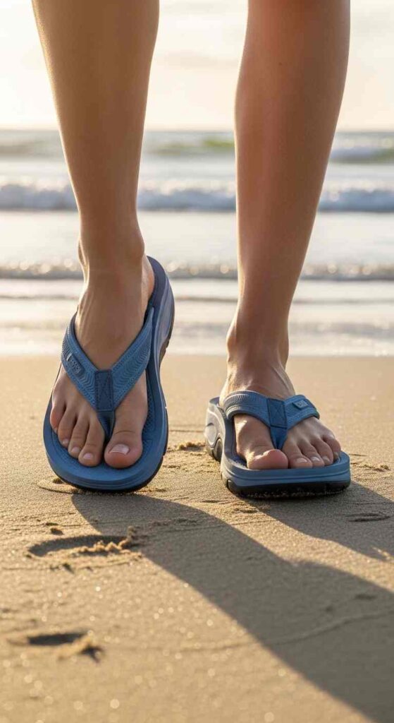 Arch support importance—flat flip-flops provide no support, causing foot fatigue during extended wear; contoured footbeds prevent this.