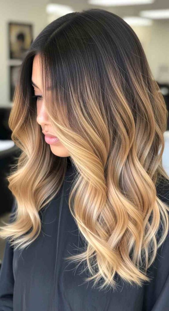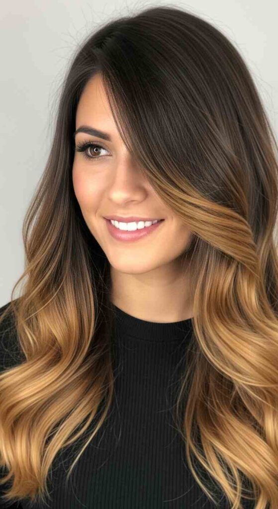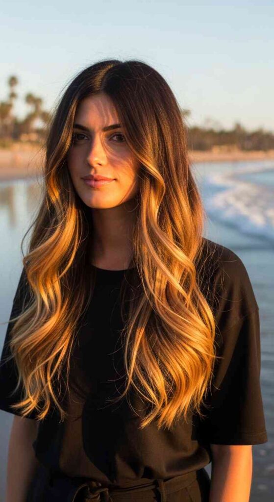 Dark roots fading to honey ends creates gradual dark hair summer transition.