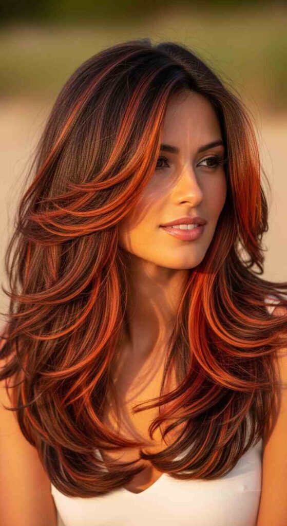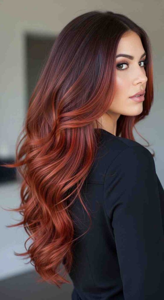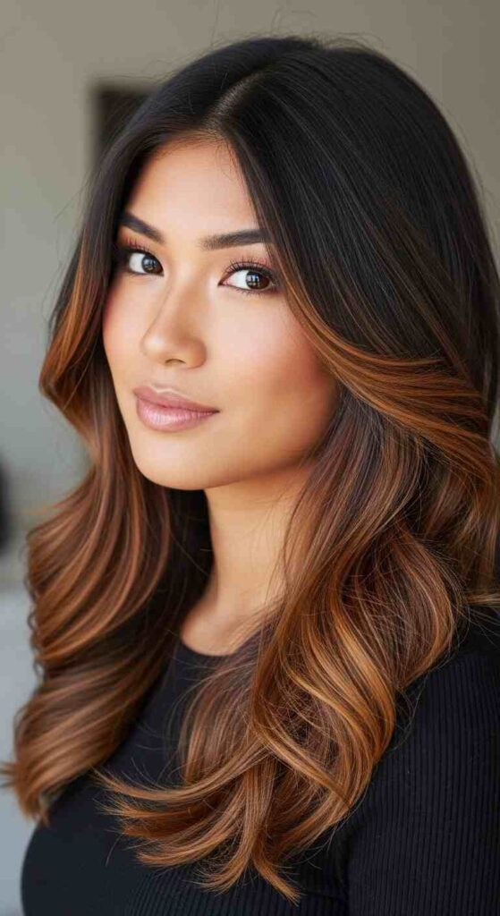 Copper and auburn—red-toned warmth creates vibrant dimension that works naturally with dark hair.